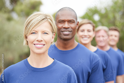 A diverse group of four smiling adults stands outdoors, wearing matching blue shirts, with a blurred natural background.