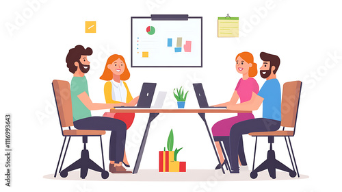 A diverse group of four young professionals collaborating around a table, engaged in a productive meeting, with laptops and presentations in a bright, modern office.