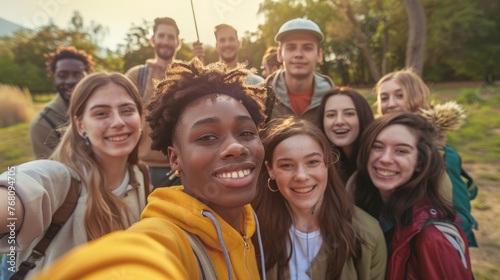 A diverse group of friends share laughs and smiles, group selfie and outdoor activities concept.