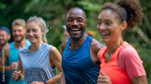 A diverse group of people of varying ages jog together in a park, exuding joy and vitality.
