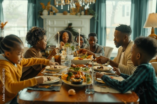 A diverse group of people sit together around a large dining table, sharing a meal, A diverse family sharing a meal around a big dining table