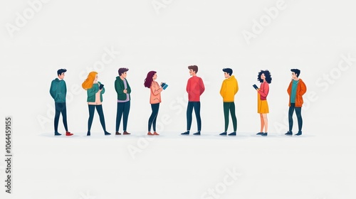 A diverse group of people standing in a line, engaged in conversation against a white isolated background.