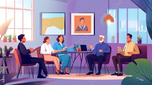 A diverse group of professionals are gathered in a stylish office space for a meeting, exchanging ideas and discussing business strategy.