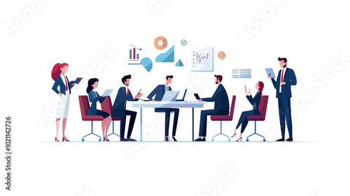 A diverse group of professionals engaged in a meeting, discussing insights and strategies in a modern office setting, featuring charts and graphs.