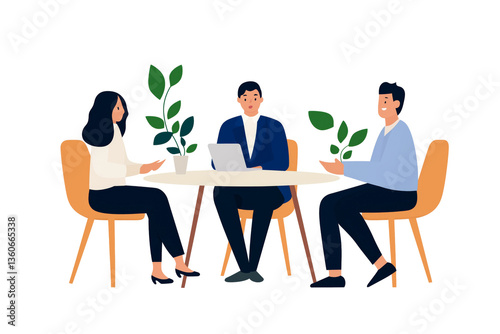 A diverse group of professionals engages in a collaborative business meeting, discussing ideas around a table with plants, showcasing modern teamwork and innovation.