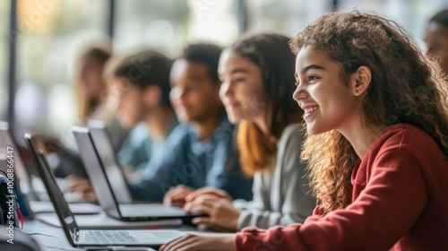 A diverse group of students engaged in an online lesson, using laptops and video conferencing to study remotely, highlighting modern education.