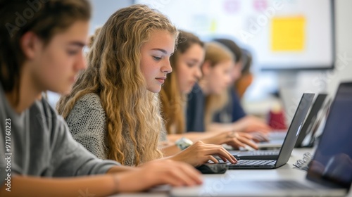 A diverse group of students is intensely working on their laptops, showcasing a collaborative educational environment in a contemporary classroom