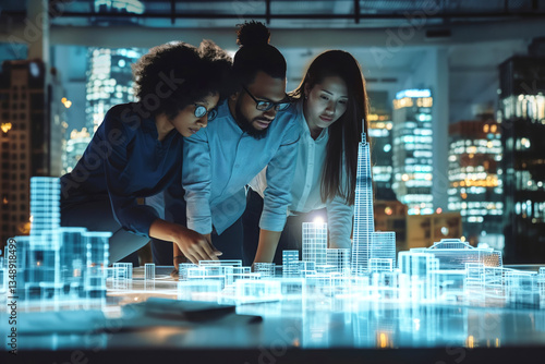 A diverse group of three professionals, engaged in a futuristic project display, against a vibrant city skyline at night.