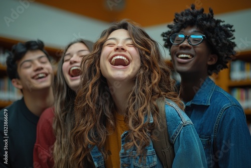 A diverse group of university students bursts into laughter in the library, sharing a joyous moment of camaraderie amidst the shelves of books and study spaces.