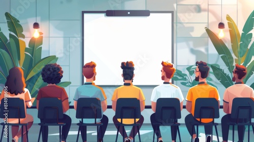 A diverse group of young professionals is seated in a contemporary office setting, facing a large presentation screen.