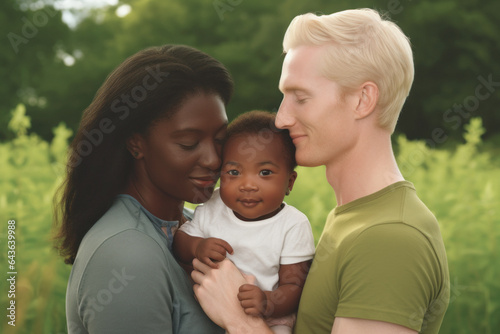 A diverse multiracial family composed of a European and an African American, with their child, celebrating the birth of their first child outdoors.