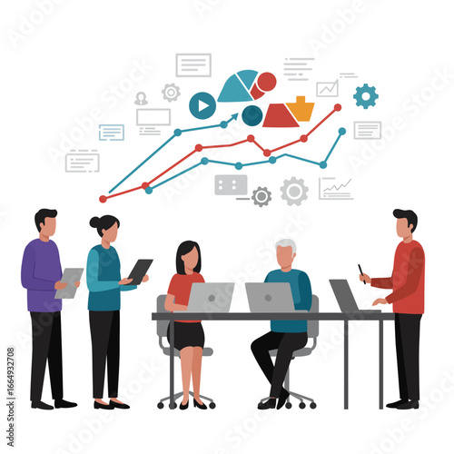 A diverse professional team collaborates on data analysis and digital marketing strategy, leveraging technology to visualize key business metrics and achieve growth.