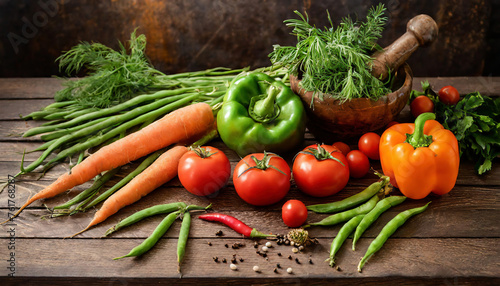 A diverse selection of fresh vegetables, including tomatoes, dill, bell peppers, carrots, and green beans on vintage wooden table