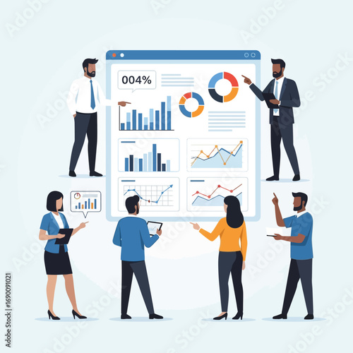 A diverse team of business professionals collaborates on data analysis, pointing at charts and graphs on a large digital dashboard.
