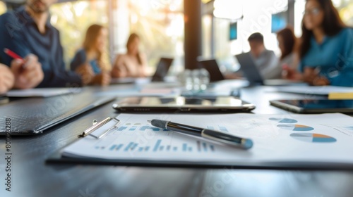 A diverse team of professionals engaged in a meeting at a modern office, discussing charts and data.