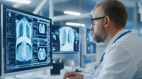 A doctor examines detailed medical scans on multiple monitors in a modern hospital setting, focusing intently on the displayed X-ray and CT images.