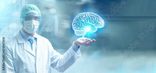 A doctor in a white coat and mask holding a digital brain hologram on a blurred background symbolizing medical technology and expertise
