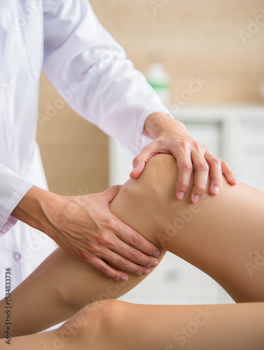 A doctor in a white coat examines and massages the knee of a patient during a medical consultation