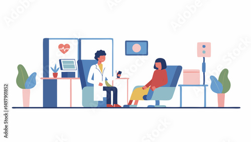 A doctor in a white coat is consulting with a patient sitting in a blue chair in an office setting