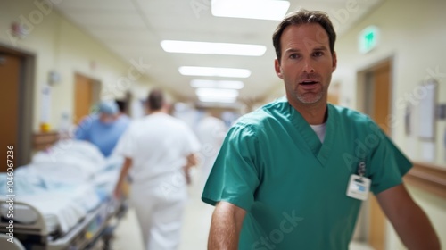 A doctor in green scrubs hurries through a bustling hospital corridor, showcasing the urgency and dedication needed in critical healthcare environments.