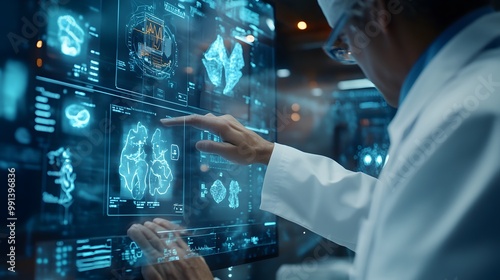 A Doctor Interacting with a Digital Interface Displaying Medical Scans