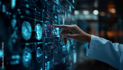 A doctor is examining medical images on the screen of an AI computer, with various patterns and data displayed in blue shades.