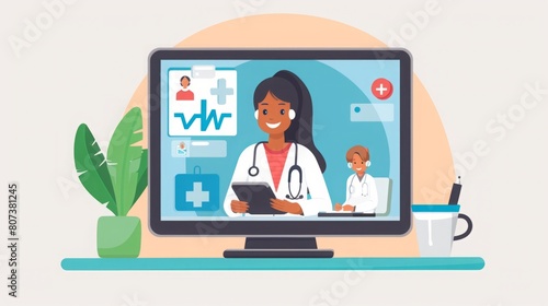 A doctor is seen on a computer screen, conducting a video consultation, with a plant placed in front of the screen.