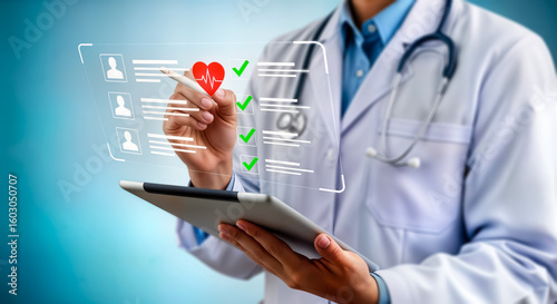 A doctor uses a tablet to interact with a digital medical record displaying a heart
