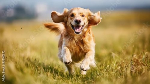A dog happily running through a field of wild grass, with its fur flying and a joyful expression on its face.