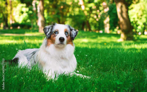 A dog of the Australian Shepherd Aussie breed lies on the green grass on the background of the park. She is 9 months old and looks away with interest. The dog is three-colored and fluffy.