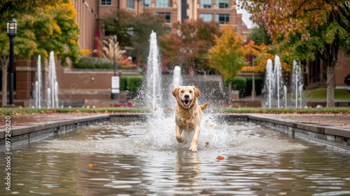 A dog runs through a shallow body of water, creating splashing water droplets around its body