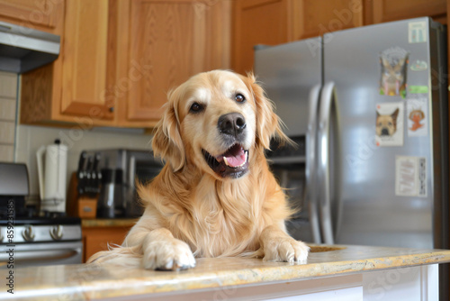 a dog sitting on a counter in a kitchen