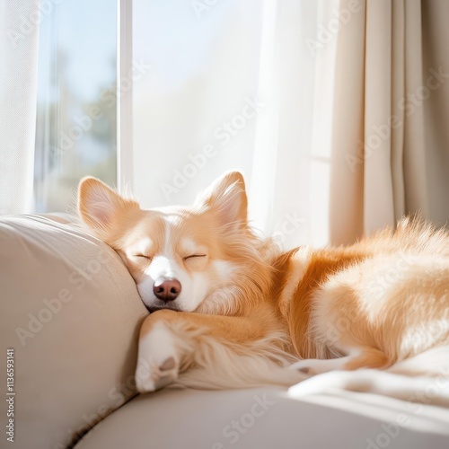 A dog sleeping on a cozy couch near a window with soft light streaming in peacefully.