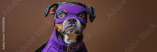 A dog wearing a purple mask and cape poses confidently against a brown background.