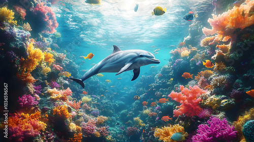 A dolphin swims through a colorful coral reef. The scene is vibrant and lively, with a variety of fish swimming around the dolphin. Concept of freedom and joy