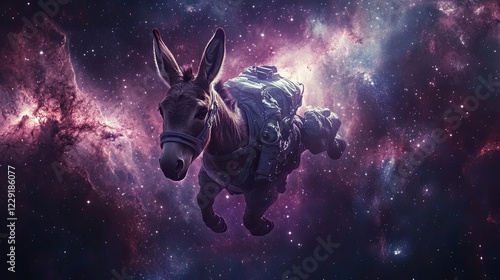 a donkey in a protective spacesuit flies in space. many stars. in the background of the nebula. high detail. fisheye lens