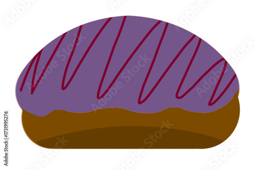 A donut illustration with purple icing and red drizzle topping, symbolizing sweet dessert and bakery treat.