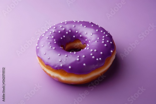 A donut with purple frosting and small white dots is placed on a solid purple background