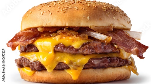 A double cheeseburger with bacon and onions on a sesame seed bun against a white background