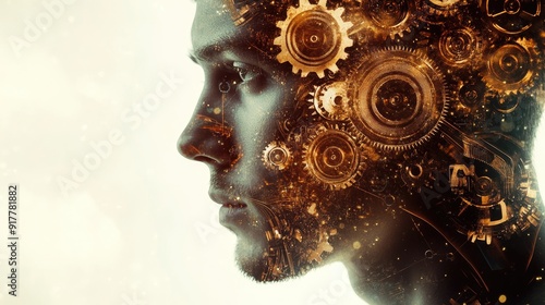 A double exposure of a man face intertwined with mechanical cogs, symbolizing the fusion of humanity and industry.