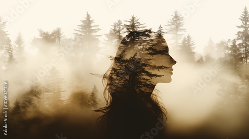 a double exposure of a woman’s face with trees and fog, space on the left side, Backlighting,generative ai illustration
