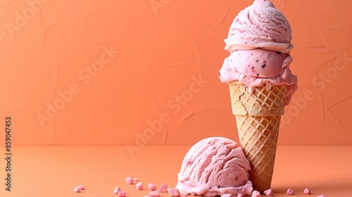 A double scoop of strawberry ice cream in a waffle cone on an orange background