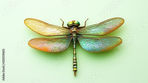 A dragonfly-shaped brooch with iridescent wings, set on a soft pastel green background.
