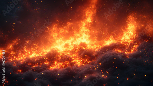 A dramatic and intense scene of a massive wildfire raging out of control,with towering flames and thick plumes of smoke billowing up against a starry night sky.