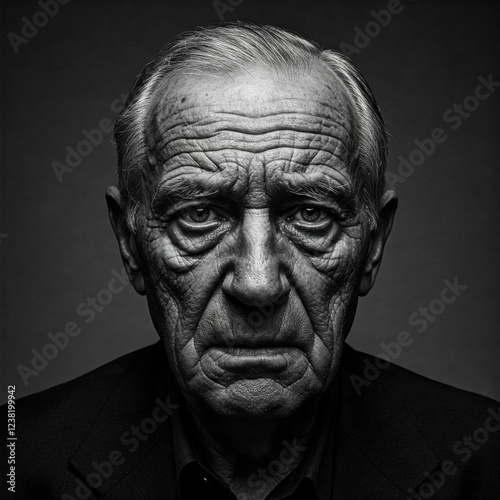 A dramatic black-and-white portrait of an elderly man, highlighting deep facial lines, intense eyes, and rich textures, evoking emotion and wisdom.