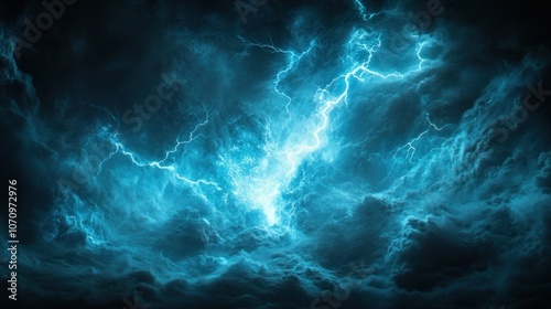 A dramatic blue lightning strike illuminates a dark, stormy sky.
