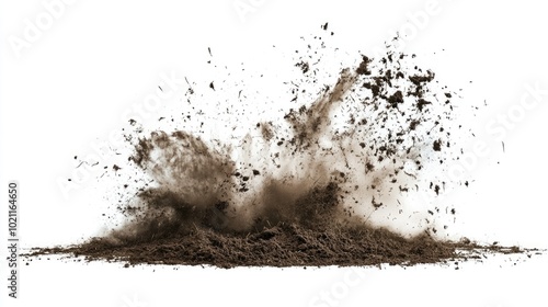 A dramatic burst of dark soil, showcasing dynamic textures and particles in motion against a clean white background.