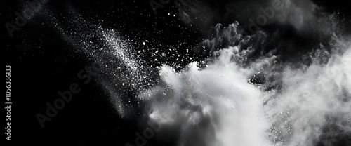 A dramatic display of white powder against a black background, creating a sense of movement.