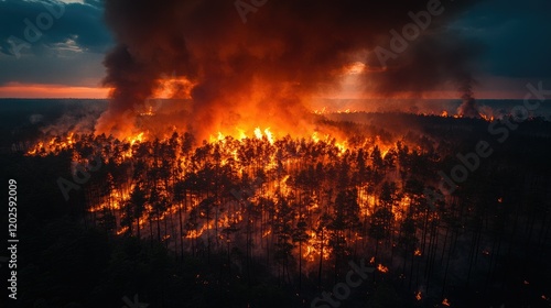 A dramatic forest fire engulfing trees, emitting thick smoke against a darkening sky.