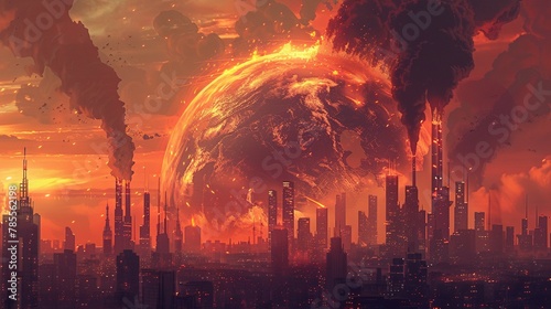 A dramatic illustration of a globe engulfed in flames, skyscrapers and industrial chimneys emitting smoke in the background